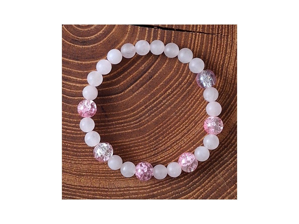 Jemný, romantický náramek v růžových tónech 💗 spojující růženín – kámen lásky, něhy a harmonie 🤍 se třpytivými praskanými skleněnými korálky ✨, které krásně odrážejí světlo.