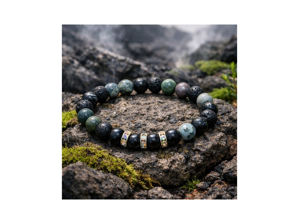 🌋 Lávový kámen – symbol síly a odvahy. Pomáhá překonávat překážky, posiluje odolnost a odvádí napětí. Jeho porézní struktura umožňuje i aplikaci esenciálních olejů, které dodávají náramku osobní energii.