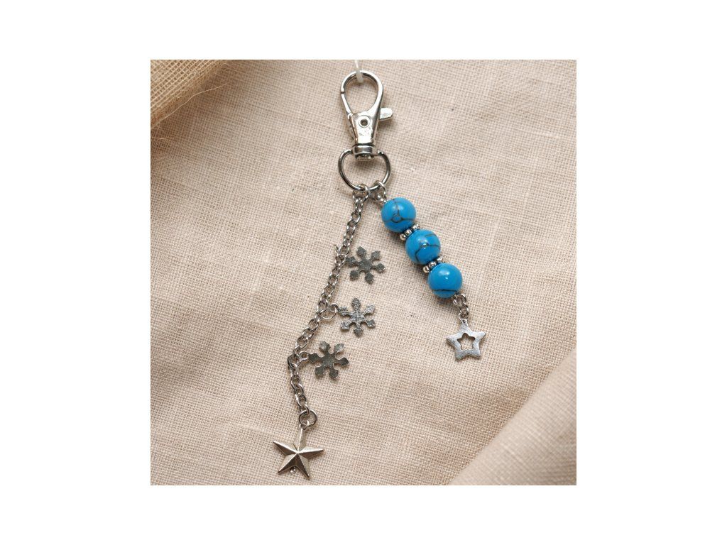 Lesklé modré korálky v kombinaci s kovovými prvky – hvězdami ⭐ a vločkami ❄️ – symbolizují čistotu, svobodu a klid duše.