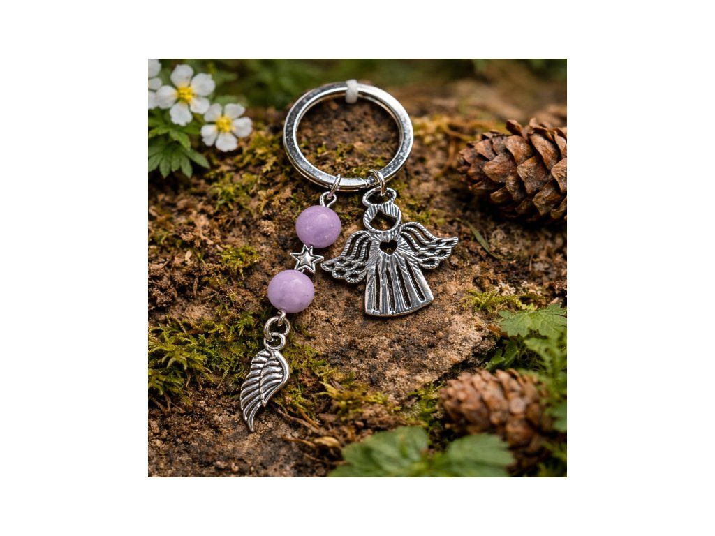 Ručně vyráběný přívěsek s kamenem fialový jadeit symbolizuje naději, klid a vnitřní sílu 💫. Jemné tóny fialové v kombinaci se stříbrnými detaily – andělem 🪽, hvězdičkou ⭐ a pírkem – vytvářejí něžný a harmonický doplněk, který přináší pocit ochrany a rovnováhy.