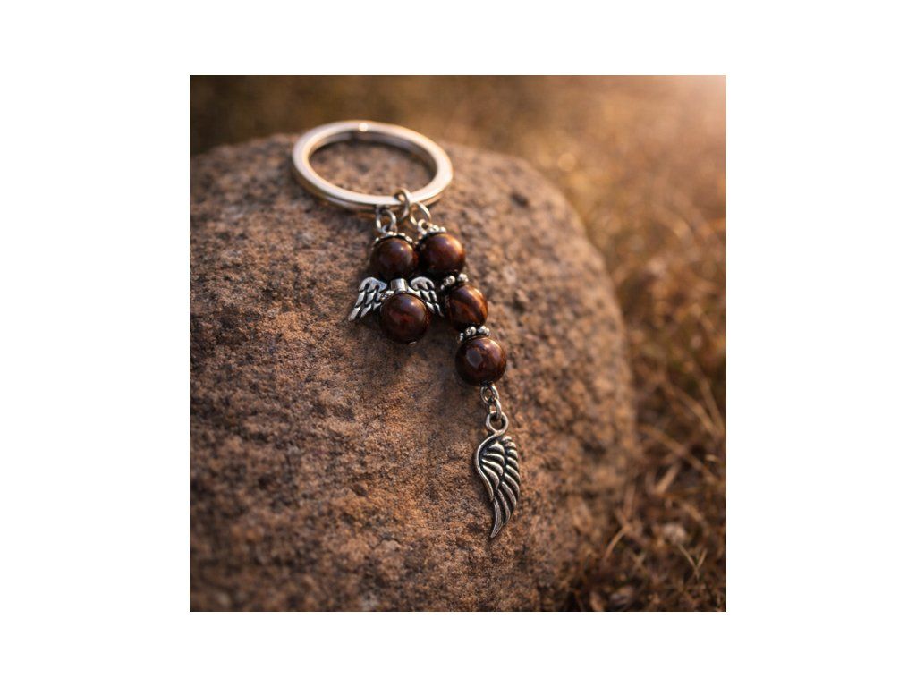 Teplé odstíny červenohnědé v kombinaci s kovovými detaily – andělskými křídly 🪽 a pírkem – vytvářejí elegantní a energický doplněk, který se stane tvým osobním talismanem 🔮.