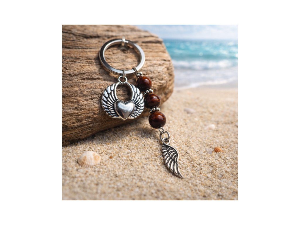 Ručně vyráběný přívěsek s kamenem býčí oko je symbolem síly 💪, odvahy a stability. Teplé červenohnědé odstíny minerálu krásně doplňují kovové detaily – ❤️ srdce s křídly, andělské pírko 🪽 a elegantní kroužek.